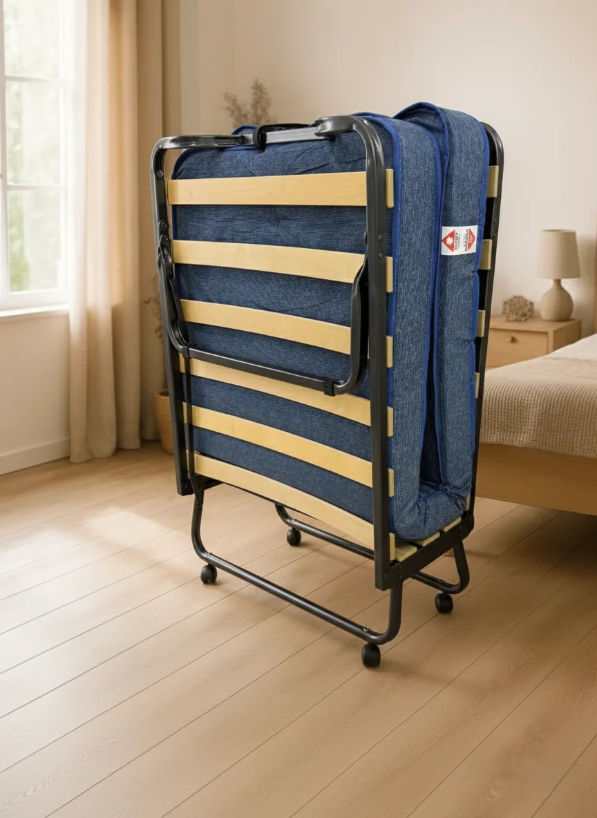 Parfait pour les appartements à Casablanca ou les maisons de vacances à Marrakech. Ce lit pliable se fait discret la journée et devient un véritable lit confortable la nuit.